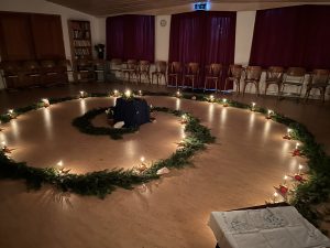 Ook dit jaar mocht de Adventstuin weer verschijnen — een bijzonder en haast magisch gebeuren. In het midden van de stille spiraal voltrok zich opnieuw dat oeroude beeld van de ziel die vanuit de geestelijke wereld neerdaalt naar de aarde, het licht meedragend dat haar is meegegeven door de engel die haar voortdurend begeleidt — als levensgids en geschenk aan de wereld: “Opdat in het aardelicht het hemellicht niet dooft.”